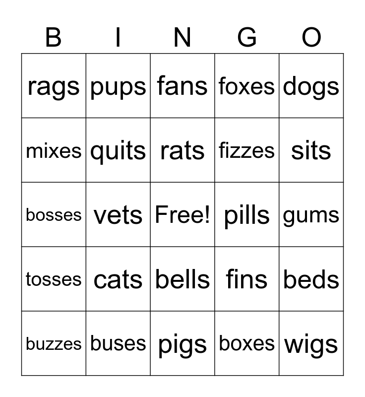 This bingo card has a free space and 24 words: cats, buses, rats, buzzes, dogs, rags, mixes, pups, pills, bells, fizzes, bosses, fins, beds, quits, boxes, gums, fans, sits, vets, wigs, tosses, foxes and pigs.