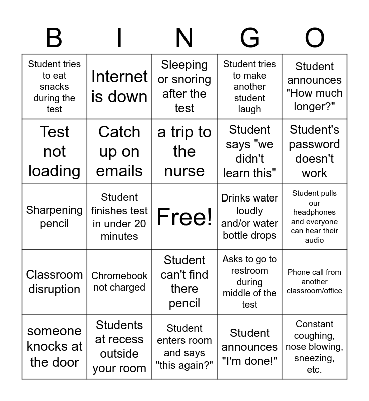 This bingo card has a free space and 24 words: Chromebook not charged, Students at recess outside your room, a trip to the nurse, someone knocks at the door, Student announces "How much longer?", Student tries to eat snacks during the test, Test not loading, Internet is down, Drinks water loudly and/or water bottle drops, Student can't find there pencil, Student says "we didn't learn this", Sharpening pencil, Asks to go to restroom during middle of the test, Phone call from another classroom/office, Catch up on emails, Student announces "I'm done!", Student pulls our headphones and everyone can hear their audio, Sleeping or snoring after the test, Student's password doesn't work, Student finishes test in under 20 minutes, Constant coughing, nose blowing, sneezing, etc., Classroom disruption, Student tries to make another student laugh and Student enters room and says "this again?".