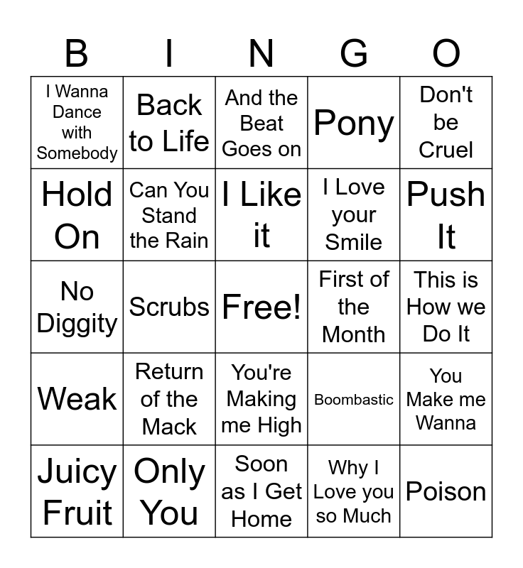 This bingo card has a free space and 34 words: Can we Talk, Why I Love you so Much, Forever My Lady, Before I let Go, Weak, Can You Stand the Rain, Don't be Cruel, Juicy Fruit, Back to Life, Candy, I Like it, And the Beat Goes on, Freaks Come Out at Night, I'm Every Woman, First of the Month, Push It, Only You, No Diggity, Return of the Mack, Boombastic, You're Making me High, Beauty, I Wanna Dance with Somebody, This is How we Do It, Soon as I Get Home, Poison, Pony, My My My, I Love your Smile, Hold On, All Around the World, Scrubs, You Make me Wanna and Freak Me.