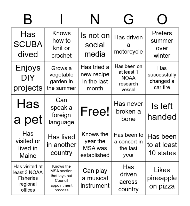 This bingo card has a free space and 29 words: Has visited at least 3 NOAA Fisheries regional offices, Finished a book in the last month, Can speak a foreign language, Does not drink coffee, Has SCUBA dived, Is not on social media, Grows a vegetable garden in the summer, Has lived in another country, Has never broken a bone, Knows the MSA section that lays out Council appointment process, Is left handed, Likes pineapple on pizza, Can play a musical instrument, Has driven across country, Has successfully changed a car tire, Has at least one sibling, Knows the year the MSA was established, Has visited or lived in Maine, Prefers summer over winter, Has a pet, Has been to a concert in the last year, Has lived in at least 5 states, Has been on at least 1 NOAA research vessel, Enjoys DIY projects, Has driven a motorcycle, Knows how to knit or crochet, Has been to at least 10 states, Has tried a new recipe in the last month and Prefers dark chocolate over milk chocolate.