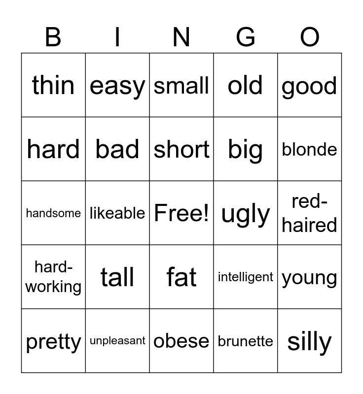 This bingo card has a free space and 24 words: tall, unpleasant, short, pretty, good, thin, hard, easy, ugly, fat, big, handsome, intelligent, young, bad, brunette, red-haired, small, blonde, likeable, silly, hard-working, old and obese.