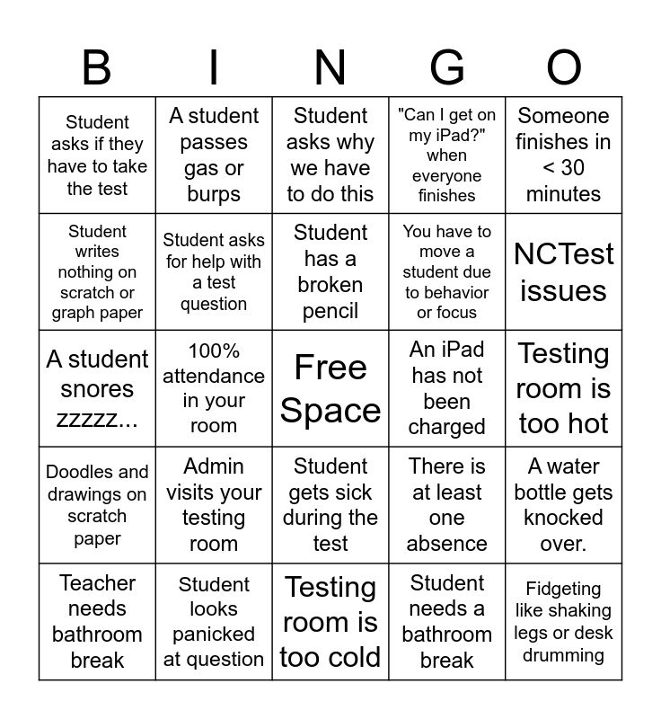 This bingo card has a free space and 24 words: Admin visits your testing room, Student looks panicked at question, Student has a broken pencil, Teacher needs bathroom break, Someone finishes in < 30 minutes, Student asks if they have to take the test, Student writes nothing on scratch or graph paper, A student passes gas or burps, An iPad has not been charged, Student gets sick during the test, You have to move a student due to behavior or focus, A student snores zzzzz..., There is at least one absence, A water bottle gets knocked over., Student asks for help with a test question, Student needs a bathroom break, Testing room is too hot, Student asks why we have to do this, NCTest issues, 100% attendance in your room, Fidgeting like shaking legs or desk drumming, Doodles and drawings on scratch paper, "Can I get on my iPad?" when everyone finishes and Testing room is too cold.