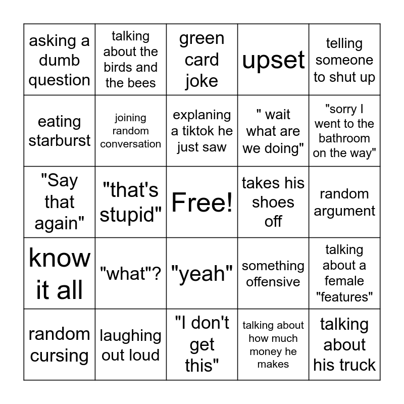 This bingo card has a free space and 24 words: "what"?, laughing out loud, explaning a tiktok he just saw, random cursing, telling someone to shut up, asking a dumb question, eating starburst, talking about the birds and the bees, takes his shoes off, "yeah", " wait what are we doing", "Say that again", something offensive, talking about a female "features", joining random conversation, talking about how much money he makes, random argument, green card joke, "sorry I went to the bathroom on the way", "that's stupid", talking about his truck, know it all, upset and "I don't get this".
