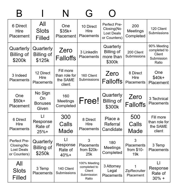 This bingo card has a free space and 49 words: 6 Direct Hire Placements, 12 Direct Hire Placements, 140 Client Submissions, 100% Meeting completed to Client Submission Ratio, Quarterly Billing of $300k, Zero Falloffs, 120 Client Submissions, All Slots Filled, Quarterly Billing of $125k, 160 Meetings Completed, 10 Direct Hire Placements, Quarterly Billing of more than $300k, 8 Direct Hire Placements, One $40k+ Placement, One $50k+ Placement, Quarterly Billing of $250k, One $35k+ Placement, 160 Client Submissions, 180 Meetings Completed, 200 Meetings Completed, 90% Meeting completed to Client Submission Ratio, Quarterly Billing of $200k, All Slots Filled, Zero Falloffs, 3 Attorney Legal Placements, 200 Client Submissions, 3 Technical Placements, Perfect Pre-Closing(No Lost Deals or Counters), No Sign On Bonuses Given, Fill more than role for the SAME client, 3 Placements from $20k-25k, Place a Referral Candidate, 3 Placements from $10-19k, 3 Temp Placements, 6 Direct Hire Placement, 3 Temp Placements, 300 Calls Made, 8 Direct Hire Placements, Zero Falloffs, 500 Calls Made, LI Response Rate of 30% +, 3 Indeed Placements, LI Response Rate of 25%+, LI Response Rate of 40%+, 3 LinkedIn Placements, Perfect Pre-Closing(No Lost Deals or Counters), 1 ZipRecruiter Placement, Fill more than role for the SAME client and 1 Leopard Law Placement.