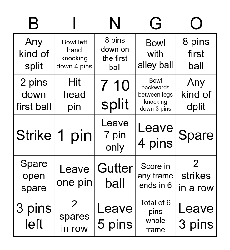 This bingo card has a free space and 24 words: Leave one pin, 2 spares in row, 7 10 split, 3 pins left, 8 pins first ball, Any kind of split, 2 pins down first ball, Bowl left hand knocking down 4 pins, Leave 4 pins, Gutter ball, Bowl backwards between legs knocking down 3 pins, Strike, Score in any frame ends in 6, 2 strikes in a row, Hit head pin, Total of 6 pins whole frame, Spare, 8 pins down on the first ball, Any kind of dplit, 1 pin, Leave 3 pins, Spare open spare, Bowl with alley ball and Leave 5 pins.