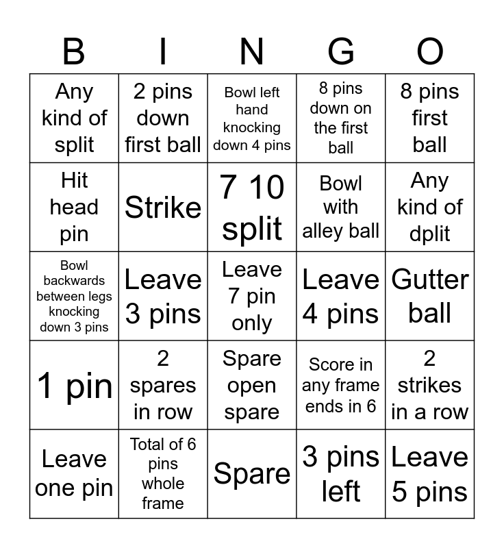 This bingo card has a free space and 24 words: Leave one pin, 2 spares in row, 7 10 split, 3 pins left, 8 pins first ball, Any kind of split, 2 pins down first ball, Bowl left hand knocking down 4 pins, Leave 4 pins, Gutter ball, Bowl backwards between legs knocking down 3 pins, Strike, Score in any frame ends in 6, 2 strikes in a row, Hit head pin, Total of 6 pins whole frame, Spare, 8 pins down on the first ball, Any kind of dplit, 1 pin, Leave 3 pins, Spare open spare, Bowl with alley ball and Leave 5 pins.