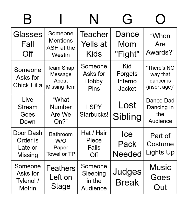 This bingo card has a free space and 39 words: Tumbling Slip, Nails Not Painted, Over Served Dance Parent, Team Snap Message About Missing Item, Someone Asks for Tylenol / Motrin, Hat / Hair Piece Falls Off, Someone Asks for Bobby Pins, Someone Walks in Front of You During a Dance, “When Are Awards?”, Door Dash Order is Late or Missing, “What Number Are We On?”, Dance Mom "Fight", Music Goes Out, Dance Dad Dancing in the Audience, Lost Sibling, Bathroom W/O Paper Towel or TP, Have You Seen Tara (Teacher)?, Glasses Fall Off, Someone is Crying, Ice Pack Needed, Someone Asks for Chick Fil’a, Someone Sleeping in the Audience, Kid Forgets Inferno Jacket, “There’s NO way that dancer is (insert age)”, Disney Song on Stage, Umbrella as a Prop, Military or Sailor Themed Costume, Can't Hear Announcer, Routine Goes Out of Order, Someone Mentions ASH at the Westin, Kid Asks to Buy a Comp Shirt, Announcer Mispronounces Kid's Name, Teacher Yells at Kids, Feathers Left on Stage, Judges Break, Drink Spills, Part of Costume Lights Up, Live Stream Goes Down and Tap Routine with Holey Jeans.