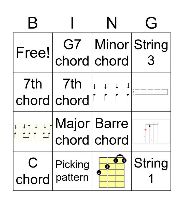 This bingo card has 5 images and 11 words: C chord, Picking pattern, Minor chord, String 3, 7th chord, G7 chord, Barre chord, Free!, 7th chord, Major chord and String 1.