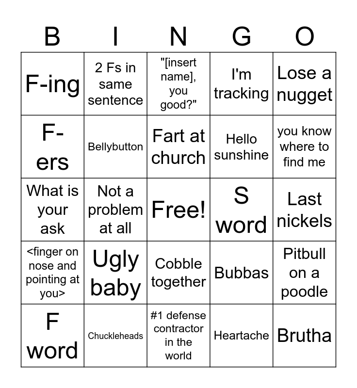 This bingo card has a free space and 24 words: Ugly baby, Chuckleheads, Fart at church, F word, Lose a nugget, F-ing, F-ers, 2 Fs in same sentence, S word, Cobble together, Hello sunshine, What is your ask, Bubbas, Pitbull on a poodle, Bellybutton, Heartache, Last nickels, "[insert name], you good?", you know where to find me, Not a problem at all, Brutha, <finger on nose and pointing at you>, I'm tracking and #1 defense contractor in the world.