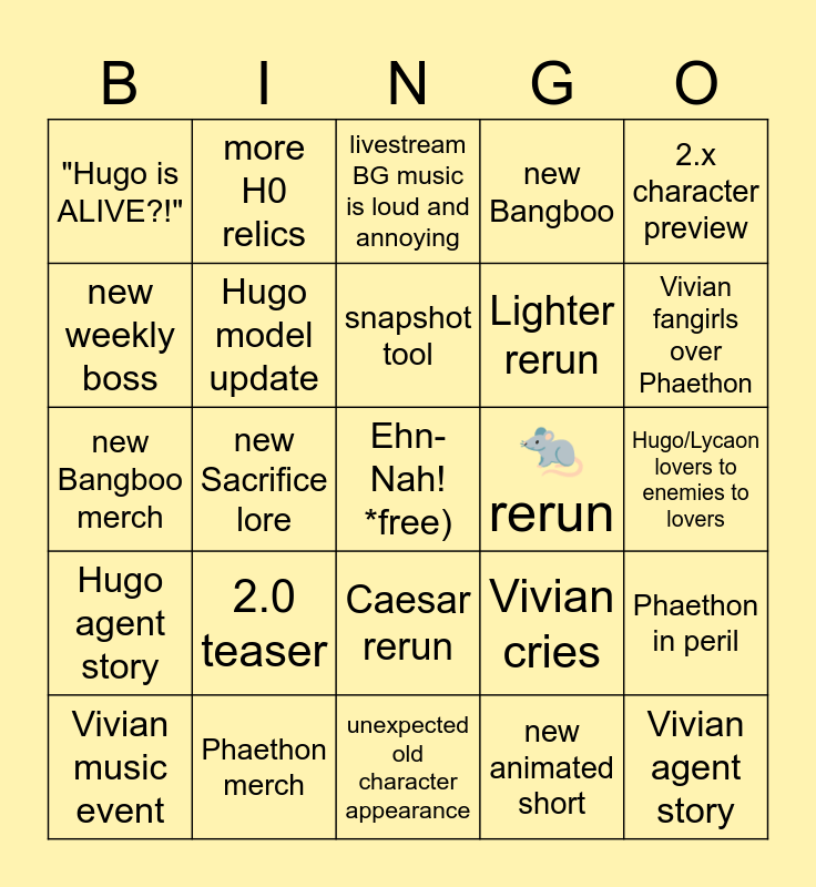 This bingo card has a free space and 24 words: 2.0 teaser, Phaethon merch, snapshot tool, Vivian music event, 2.x character preview, "Hugo is ALIVE?!", new weekly boss, more H0 relics, 🐀 rerun, Caesar rerun, Lighter rerun, new Bangboo merch, Vivian cries, Phaethon in peril, Hugo model update, new animated short, Hugo/Lycaon lovers to enemies to lovers, livestream BG music is loud and annoying, Vivian fangirls over Phaethon, new Sacrifice lore, Vivian agent story, Hugo agent story, new Bangboo and unexpected old character appearance.