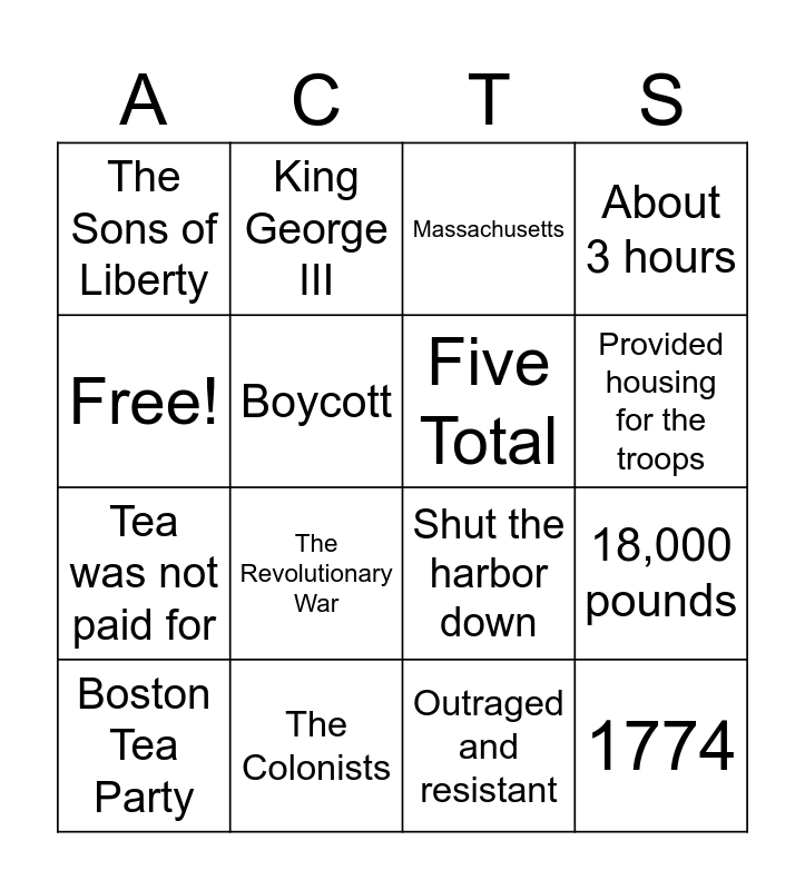 This bingo card has 16 words: The Colonists, 18,000 pounds, Massachusetts, The Sons of Liberty, Tea was not paid for, King George III, Shut the harbor down, Outraged and resistant, Free!, Boycott, Boston Tea Party, About 3 hours, The Revolutionary War, Provided housing for the troops, Five Total and 1774.
