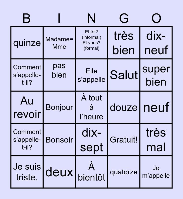 This bingo card has 25 words: Bonsoir, À bientôt, Elle s’appelle, Je suis triste., dix-neuf, quinze, Comment s’appelle-t-il?, Madame= Mme, douze, dix-sept, Salut, Au revoir, Gratuit!, très mal, pas bien, Je m’appelle, neuf, Et toi? (informal) Et vous? (formal), super bien, Bonjour, À tout à l’heure, deux, Comment s’appelle-t-il?, très bien and quatorze.