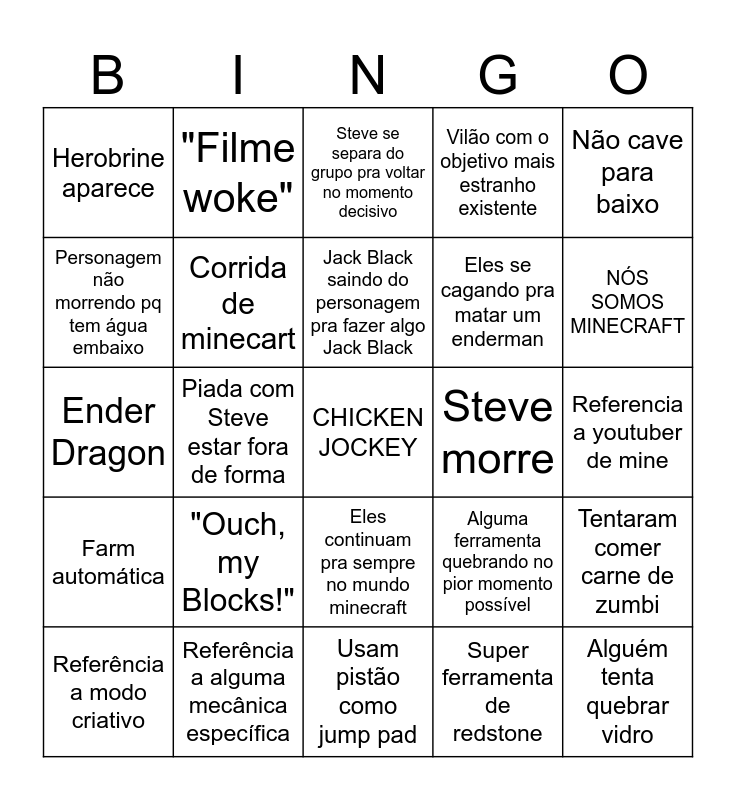 This bingo card has a free space and 24 words: "Ouch, my Blocks!", Referência a alguma mecânica específica, Jack Black saindo do personagem pra fazer algo Jack Black, Referência a modo criativo, Não cave para baixo, Herobrine aparece, Personagem não morrendo pq tem água embaixo, "Filme woke", Steve morre, Eles continuam pra sempre no mundo minecraft, Eles se cagando pra matar um enderman, Ender Dragon, Alguma ferramenta quebrando no pior momento possível, Tentaram comer carne de zumbi, Corrida de minecart, Super ferramenta de redstone, Referencia a youtuber de mine, Steve se separa do grupo pra voltar no momento decisivo, NÓS SOMOS MINECRAFT, Piada com Steve estar fora de forma, Alguém tenta quebrar vidro, Farm automática, Vilão com o objetivo mais estranho existente and Usam pistão como jump pad.