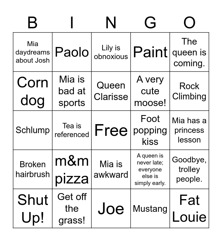This bingo card has a free space and 29 words: Shut Up!, Josh is a show off, Tea is referenced, Genovia is mentioned, Mia daydreams about Josh, Lily is obnoxious, Mia is bad at sports, m&m pizza, Foot popping kiss, Get off the grass!, Mia has a princess lesson, Fat Louie, Joe, Mustang, Rock Climbing, Pears, Mia is awkward, Broken hairbrush, The queen is coming., Schlump, A queen is never late; everyone else is simply early., Tiara, A very cute moose!, Corn dog, Paint, Paolo, Goodbye, trolley people., Queen Clarisse and Mattress surfing.