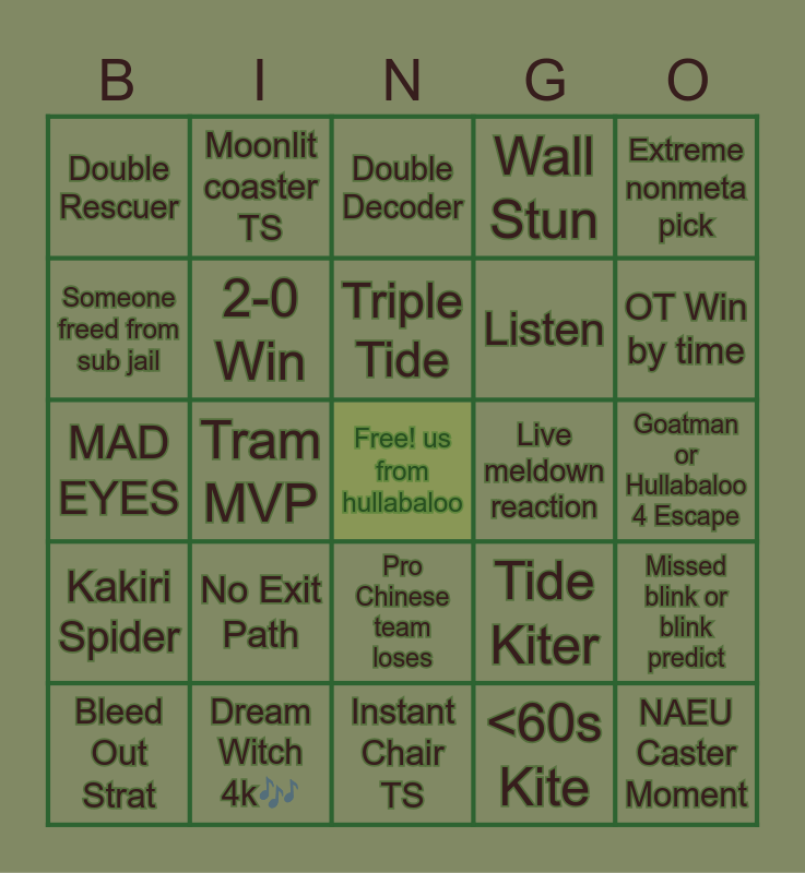 This bingo card has a free space and 29 words: Bleed Out Strat, Basement Party, Tram MVP, Warp Fail, Double Rescuer, Double Decoder, 2-0 Win, No Exit Path, Live meldown reaction, Dream Witch 4k🎶, Goatman or Hullabaloo 4 Escape, NAEU Caster Moment, Instant Chair TS, <60s Kite, OT Win by time, Surv epic hiding W, Pro Chinese team loses, Kakiri Spider, Extreme nonmeta pick, MAD EYES, Tide Kiter, Schmiddy TS, Listen, Someone freed from sub jail, Wall Stun, Moonlit coaster TS, Missed blink or blink predict, Triple Tide and Nobody has BT.