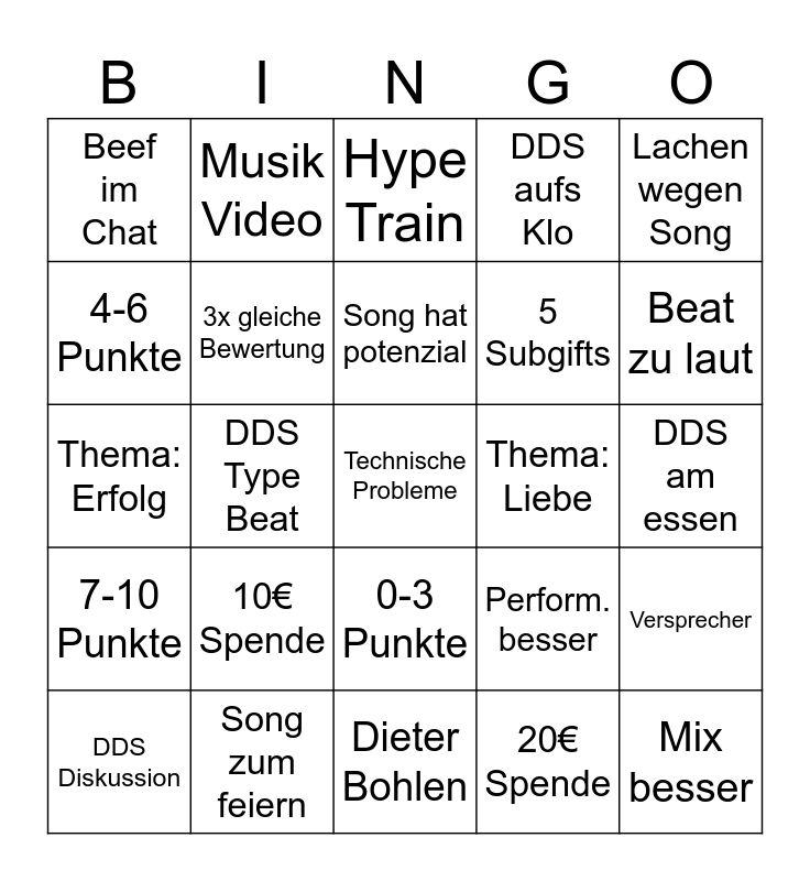 This bingo card has a free space and 24 words: 10€ Spende, Song zum feiern, Song hat potenzial, DDS Diskussion, Lachen wegen Song, Beef im Chat, 4-6 Punkte, Musik Video, Thema: Liebe, 0-3 Punkte, 5 Subgifts, Thema: Erfolg, Perform. besser, Versprecher, 3x gleiche Bewertung, 20€ Spende, DDS am essen, Hype Train, Beat zu laut, DDS Type Beat, Mix besser, 7-10 Punkte, DDS aufs Klo and Dieter Bohlen.