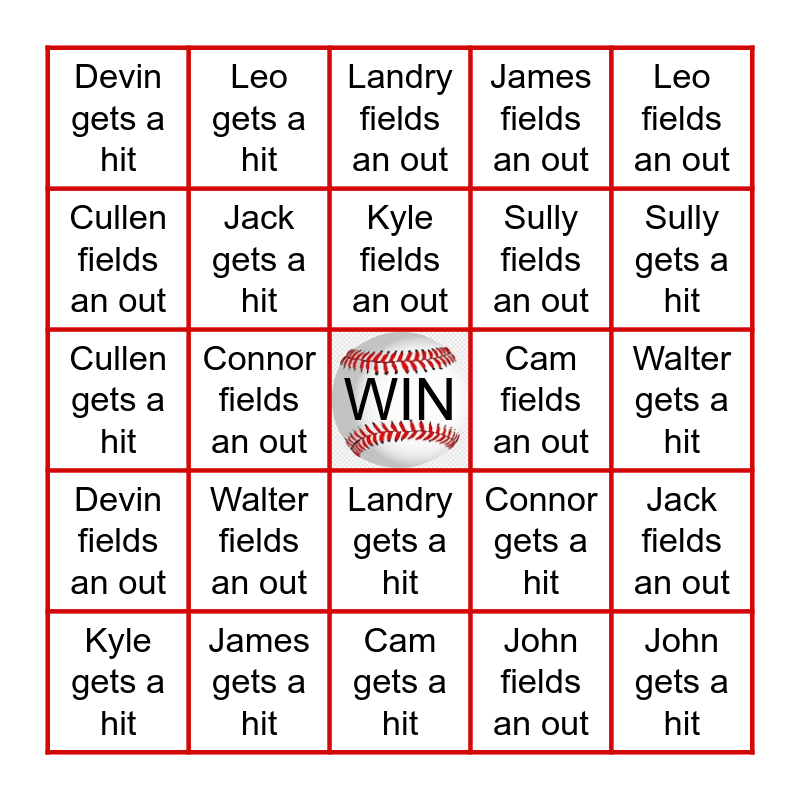 This bingo card has a free space and 24 words: Walter fields an out, James gets a hit, Kyle fields an out, Kyle gets a hit, Leo fields an out, Devin gets a hit, Cullen fields an out, Leo gets a hit, Cam fields an out, Landry gets a hit, Sully fields an out, Cullen gets a hit, Connor gets a hit, Jack fields an out, Jack gets a hit, John fields an out, Walter gets a hit, Landry fields an out, Sully gets a hit, Connor fields an out, John gets a hit, Devin fields an out, James fields an out and Cam gets a hit.