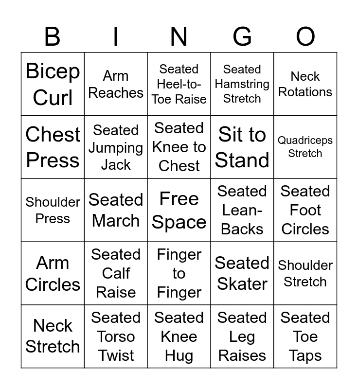 This bingo card has a free space and 24 words: Seated Calf Raise, Seated Torso Twist, Seated Knee to Chest, Neck Stretch, Neck Rotations, Bicep Curl, Chest Press, Arm Reaches, Seated Lean-Backs, Finger to Finger, Sit to Stand, Shoulder Press, Seated Skater, Shoulder Stretch, Seated Jumping Jack, Seated Leg Raises, Seated Foot Circles, Seated Heel-to-Toe Raise, Quadriceps Stretch, Seated March, Seated Toe Taps, Arm Circles, Seated Hamstring Stretch and Seated Knee Hug.