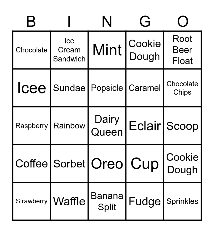 This bingo card has a free space and 29 words: Vanilla, Waffle, Mint, Gelato, Root Beer Float, Chocolate, Sundae, Popsicle, Eclair, Cookie Dough, Strawberry, Rainbow, Fudge, Sprinkles, Raspberry, Cone, Banana Split, Cup, Chocolate Chips, Coffee, Sorbet, Whipped Cream, Caramel, Scoop, Icee, Ice Cream Sandwich, Oreo, Cookie Dough and Milkshake.