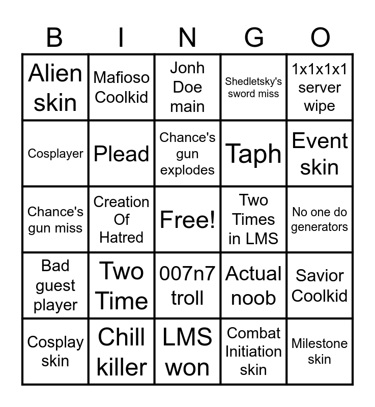 This bingo card has a free space and 24 words: Two Time, Chill killer, Chance's gun explodes, Cosplay skin, 1x1x1x1 server wipe, Alien skin, Cosplayer, Mafioso Coolkid, Two Times in LMS, 007n7 troll, Taph, Chance's gun miss, Actual noob, Savior Coolkid, Plead, Combat Initiation skin, No one do generators, Jonh Doe main, Event skin, Creation Of Hatred, Milestone skin, Bad guest player, Shedletsky's sword miss and LMS won.
