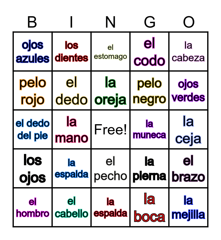 This bingo card has a free space and 32 words: la boca, el pie, la mano, la nariz, los ojos, el dedo, la cabeza, el brazo, los dientes, la lengua, la oreja, el estomago, la rodilla, el cuello, la muneca, la cara, el hombro, el dedo del pie, el pecho, la espalda, la pierna, el tibillo, la ceja, el cabello, la mejilla, el codo, pelo negro, pelo rojo, ojos azules, la espalda, la barriga and ojos verdes.