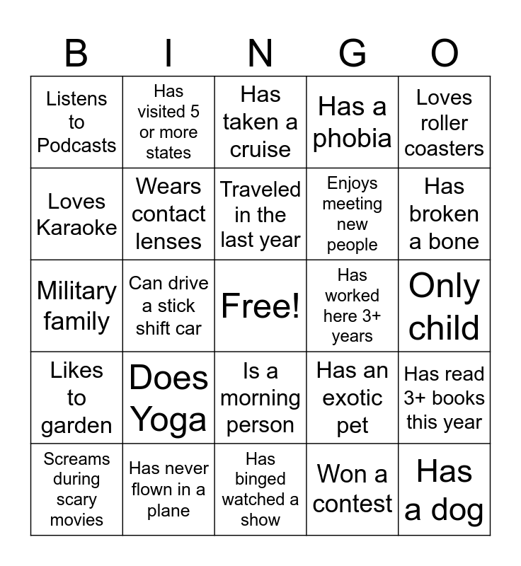 This bingo card has a free space and 24 words: Screams during scary movies, Does Yoga, Traveled in the last year, Won a contest, Loves roller coasters, Listens to Podcasts, Has visited 5 or more states, Has taken a cruise, Has worked here 3+ years, Only child, Military family, Wears contact lenses, Has an exotic pet, Has read 3+ books this year, Loves Karaoke, Has never flown in a plane, Has binged watched a show, Has a phobia, Has broken a bone, Likes to garden, Can drive a stick shift car, Is a morning person, Enjoys meeting new people and Has a dog.