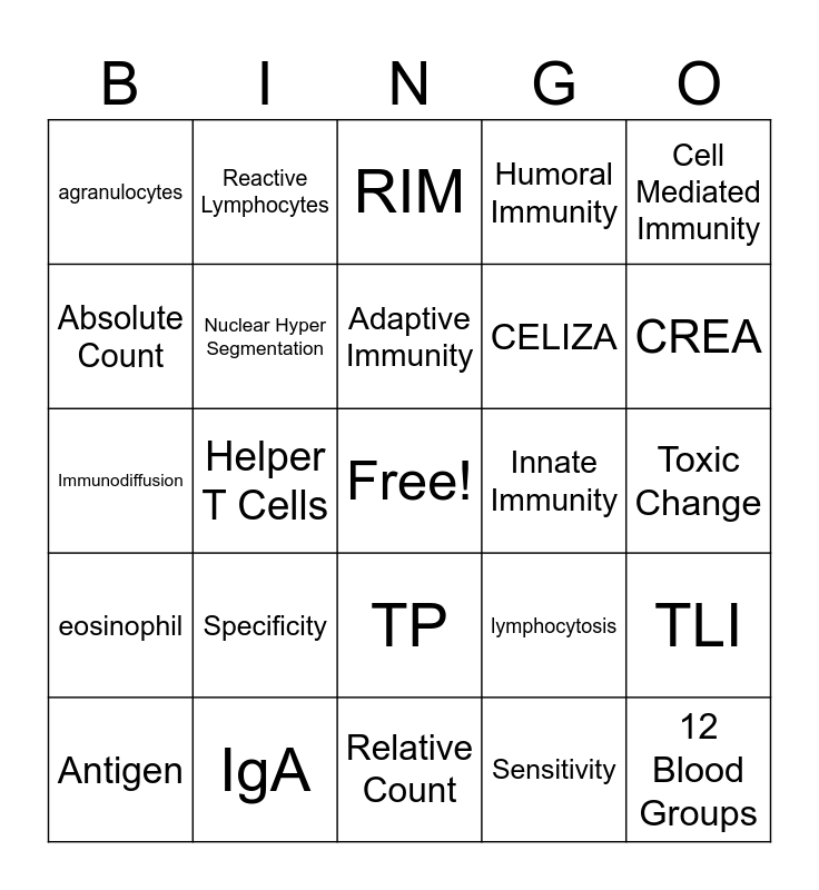 This bingo card has a free space and 73 words: myeloblast, granulocyte, agranulocytes, neutrophil, lymphocyte, monocyte, eosinophil, basophil, lymphocytosis, neutrophilia, monocytosis, Pelger-Huet Anomaly, Nuclear Hyper Segmentation, Toxic Change, Intracytoplasmic Inclusions, Reactive Lymphocytes, Relative Count, Absolute Count, Left Shift, Innate Immunity, Adaptive Immunity, Humoral Immunity, Cell Mediated Immunity, Avidity, Antigen, Affinity, Titer, IgM, IgG, IgE, IgA, B Memory Cells, Effector Cells, Killer T Cells, Helper T Cells, Suppressor T Cells, Immediate Hypersensitivity, Antibody- mediated Disease, 12 Blood Groups, 3 Blood Groups, Sensitivity, Specificity, False Positive, False Negative, ELIZA, CELIZA, RIM, Coombs, Latex Agglutination, Immunodiffusion, Hematology Analyzers, Clinical Chemistry Analyzers, ALT, AST, ALKP, GGT, LDH, TP, ALB, TBIL, Bile Acids, CHOL, BUN, CREA, SDMA, GLU, AMYL, LIPA, TLI, PLI, CK, Endocrine and Exocrine.