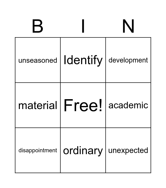 This bingo card has a free space and 9 words: disappointment, development, Identify, material, unseasoned, academic, unexpected, humanity and ordinary.