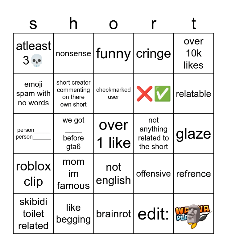 This bingo card has 1 images, a free space and 24 words: mom im famous, like begging, checkmarked user, skibidi toilet related, over 10k likes, atleast 3💀, emoji spam with no words, nonsense, not anything related to the short, not english, ❌✅, person_____ person______, offensive, refrence, short creator commenting on there own short, edit:, glaze, funny, relatable, we got ____ before gta6, 🗿, roblox clip, cringe and brainrot.