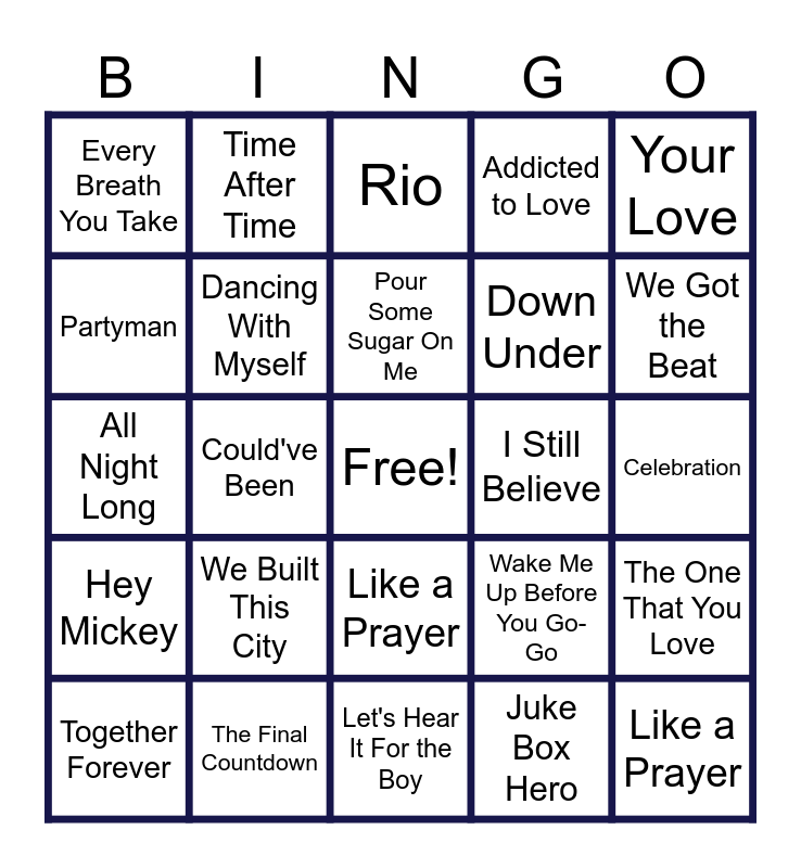 This bingo card has a free space and 24 words: We Built This City, The Final Countdown, Pour Some Sugar On Me, Together Forever, Your Love, Every Breath You Take, Partyman, Time After Time, I Still Believe, Like a Prayer, Down Under, All Night Long, Wake Me Up Before You Go-Go, The One That You Love, Dancing With Myself, Juke Box Hero, Celebration, Rio, We Got the Beat, Could've Been, Like a Prayer, Hey Mickey, Addicted to Love and Let's Hear It For the Boy.