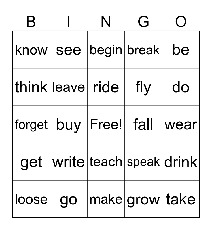 This bingo card has a free space and 24 words: write, go, ride, loose, be, know, think, see, fall, teach, fly, forget, speak, drink, leave, grow, wear, begin, do, buy, take, get, break and make.