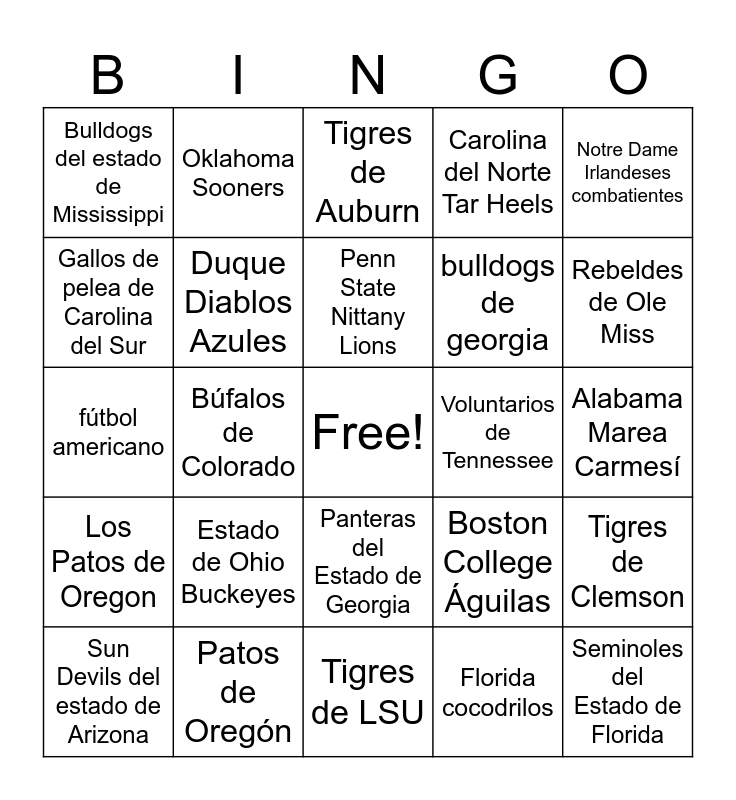 This bingo card has a free space and 24 words: Estado de Ohio Buckeyes, Patos de Oregón, Penn State Nittany Lions, Sun Devils del estado de Arizona, Notre Dame Irlandeses combatientes, Bulldogs del estado de Mississippi, Gallos de pelea de Carolina del Sur, Oklahoma Sooners, Voluntarios de Tennessee, Panteras del Estado de Georgia, bulldogs de georgia, fútbol americano, Boston College Águilas, Tigres de Clemson, Duque Diablos Azules, Florida cocodrilos, Alabama Marea Carmesí, Tigres de Auburn, Rebeldes de Ole Miss, Búfalos de Colorado, Seminoles del Estado de Florida, Los Patos de Oregon, Carolina del Norte Tar Heels and Tigres de LSU.