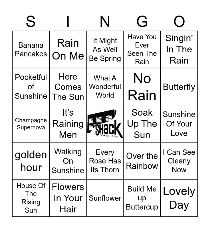 This bingo card has a free space and 50 words: Flowers, Lovely Day, Roses, Sunflower, Walking On Sunshine, Umbrella, Rain On Me, Don't Rain On My Parade, Pocketful of Sunshine, Set Fire to the Rain, Here Comes The Sun, Have You Ever Seen The Rain, I Can See Clearly Now, Over the Rainbow, Only Happy When It Rains, Dreams, What A Wonderful World, Soak Up The Sun, Come Clean, Singin' In The Rain, It's Raining Men, Build Me up Buttercup, Banana Pancakes, No Rain, Chasing Thunder, Golden, Butterfly, Butterflies, It Might As Well Be Spring, Every Rose Has Its Thorn, Purple Rain, Raindrops Keep Fallin' On My Head, You Are The Sunshine Of My Life, Beautiful Day, Flowers In Your Hair, Marigold, Kiss from a Rose, A Hard Rain's A-Gonna Fall, When It Rains, Sunshine Of Your Love, Blister In The Sun, Thunderstruck, Lightning Crashes, Lavender Haze, House Of The Rising Sun, Champagne Supernova, Thunder, When It Rains It Pours, golden hour and Spring Breakdown.
