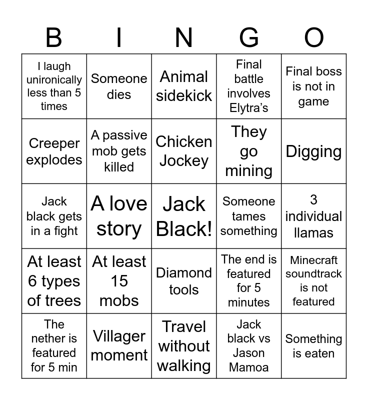 This bingo card has a free space and 24 words: At least 15 mobs, Villager moment, Chicken Jockey, The nether is featured for 5 min, Final boss is not in game, I laugh unironically less than 5 times, Creeper explodes, Someone dies, Someone tames something, Diamond tools, They go mining, Jack black gets in a fight, The end is featured for 5 minutes, Minecraft soundtrack is not featured, A passive mob gets killed, Jack black vs Jason Mamoa, 3 individual llamas, Animal sidekick, Digging, A love story, Something is eaten, At least 6 types of trees, Final battle involves Elytra’s and Travel without walking.