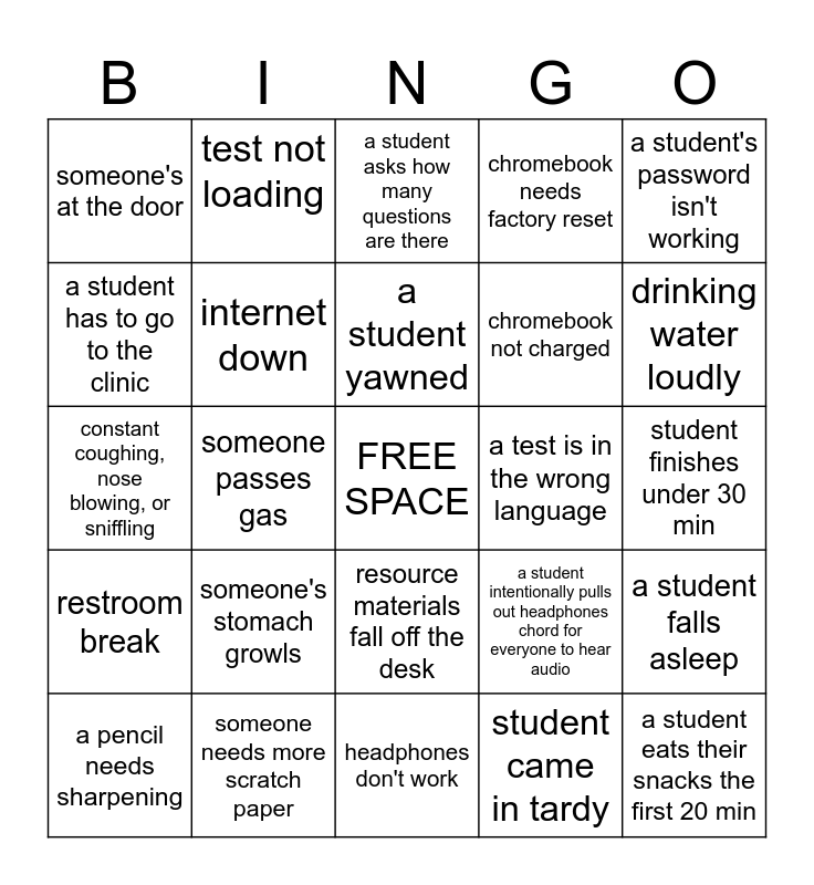 This bingo card has a free space and 24 words: someone's stomach growls, someone needs more scratch paper, a student yawned, a pencil needs sharpening, a student's password isn't working, someone's at the door, a student has to go to the clinic, test not loading, a test is in the wrong language, resource materials fall off the desk, chromebook not charged, constant coughing, nose blowing, or sniffling, a student intentionally pulls out headphones chord for everyone to hear audio, a student falls asleep, internet down, student came in tardy, student finishes under 30 min, a student asks how many questions are there, drinking water loudly, someone passes gas, a student eats their snacks the first 20 min, restroom break, chromebook needs factory reset and headphones don't work.
