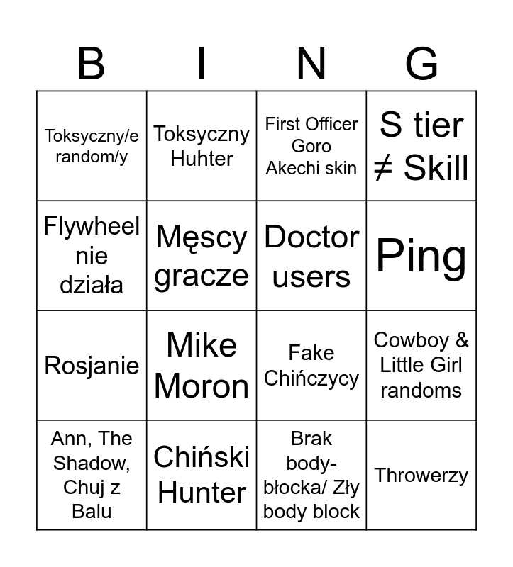 This bingo card has 16 words: Chiński Hunter, Cowboy & Little Girl randoms, First Officer Goro Akechi skin, Toksyczny/e random/y, Rosjanie, Toksyczny Huhter, Fake Chińczycy, Brak body-błocka/ Zły body block, Flywheel nie działa, Męscy gracze, Ann, The Shadow, Chuj z Balu, S tier ≠ Skill, Mike Moron, Ping, Doctor users and Throwerzy.