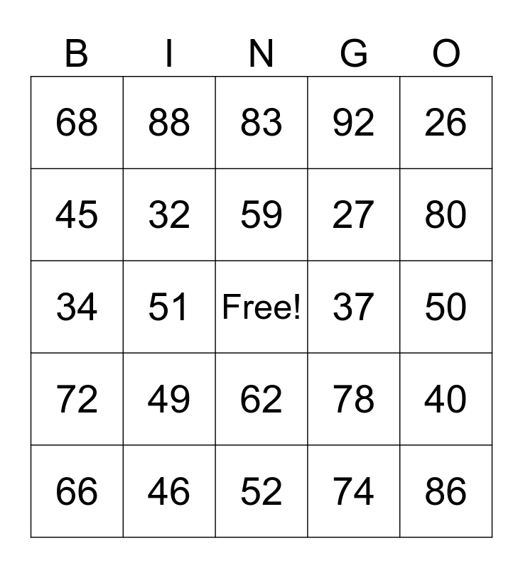 This bingo card has a free space and 33 words: 68, 52, 51, 84, 72, 32, 26, 66, 88, 82, 59, 83, 75, 93, 37, 80, 46, 34, 49, 78, 62, 34, 68, 50, 52, 86, 92, 27, 45, 40, 39, 74 and 61.