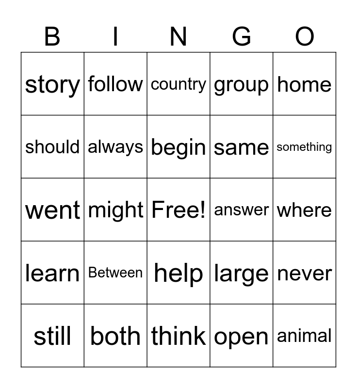 This bingo card has a free space and 24 words: Between, both, begin, still, home, story, should, follow, answer, help, same, went, large, never, always, open, where, country, something, might, animal, learn, group and think.