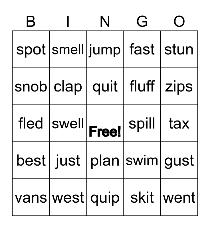 This bingo card has a free space and 24 words: just, west, quit, vans, stun, spot, snob, smell, spill, plan, fluff, fled, swim, gust, clap, skit, tax, jump, zips, swell, went, best, fast and quip.
