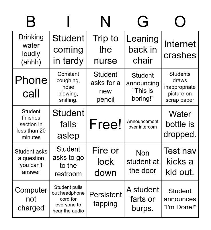 This bingo card has a free space and 24 words: Student asks to go to the restroom, Student pulls out headphone cord for everyone to hear the audio, Student asks for a new pencil, Computer not charged, Internet crashes, Drinking water loudly (ahhh), Phone call, Student coming in tardy, Announcement over intercom, Fire or lock down, Student announcing "This is boring!", Student finishes section in less than 20 minutes, Non student at the door, Test nav kicks a kid out., Constant coughing, nose blowing, sniffing., A student farts or burps., Water bottle is dropped., Trip to the nurse, Students draws inappropriate picture on scrap paper, Student falls aslep, Student announces "I'm Done!", Student asks a question you can't answer, Leaning back in chair and Persistent tapping.