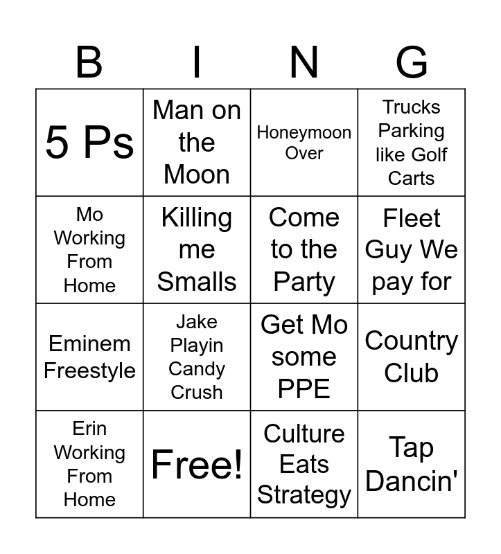 This bingo card has 16 words: Free!, Country Club, Honeymoon Over, 5 Ps, Eminem Freestyle, Man on the Moon, Get Mo some PPE, Culture Eats Strategy, Mo Working From Home, Killing me Smalls, Erin Working From Home, Trucks Parking like Golf Carts, Jake Playin Candy Crush, Fleet Guy We pay for, Come to the Party and Tap Dancin'.