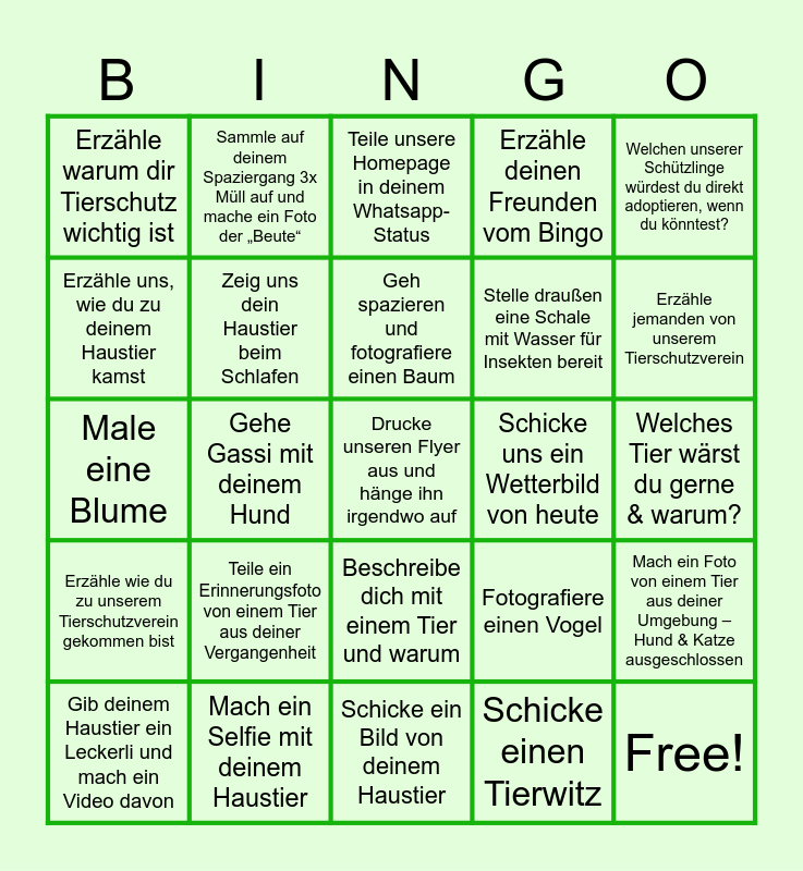 This bingo card has 31 words: Schicke ein Bild von deinem Haustier, Mache ein Bild deines Haustieres mit einer Blume, Gehe Gassi mit deinem Hund, Male ein Tierbild, Erzähle warum dir Tierschutz wichtig ist, Teile unsere Homepage in deinem Whatsapp-Status, Zeig uns dein Haustier beim Schlafen, Fotografiere einen Vogel, Schicke uns ein Wetterbild von heute, Schicke einen Tierwitz, Welches Tier wärst du gerne & warum?, Drucke unseren Flyer aus und hänge ihn irgendwo auf, Free!, Suche dir einen Schützling aus, der dir besonders gefällt, Erzähle jemanden von unserem Tierschutzverein, Lass deinen Hund ein Kommando machen und filme es, Mach ein Foto von einem Tier aus deiner Umgebung – Hund & Katze ausgeschlossen, Teile ein Erinnerungsfoto von einem Tier aus deiner Vergangenheit, Erzähle wie du zu unserem Tierschutzverein gekommen bist, Beschreibe dich mit einem Tier und warum, Welchen unserer Schützlinge würdest du direkt adoptieren, wenn du könntest?, Bereite ein Gericht ohne tierische Produkte zu und teile es, Gib deinem Haustier ein Leckerli und mach ein Video davon, Sammle auf deinem Spaziergang 3x Müll auf und mache ein Foto der „Beute“, Stelle draußen eine Schale mit Wasser für Insekten bereit, Erzähle uns, wie du zu deinem Haustier kamst, Erzähle deinen Freunden vom Bingo, Male eine Blume, Mach ein Selfie mit deinem Haustier, Geh spazieren und fotografiere einen Baum and Spende 5 Euro an Tierischgeholfen e.V.