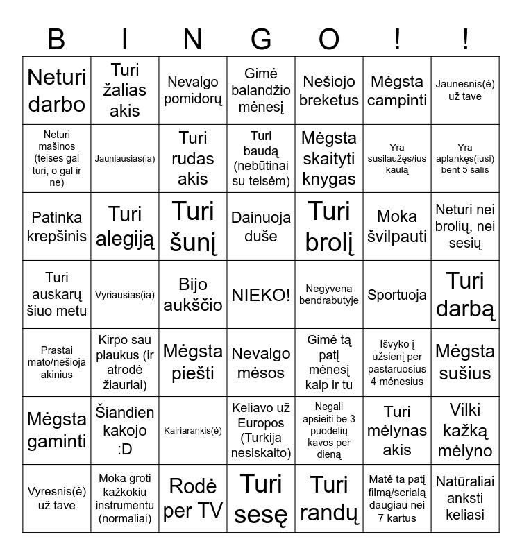 This bingo card has a free space and 48 words: Negali apsieiti be 3 puodelių kavos per dieną, Yra susilaužęs/ius kaulą, Turi sesę, Vyriausias(ia), Turi šunį, Turi darbą, Turi žalias akis, Moka groti kažkokiu instrumentu (normaliai), Mėgsta campinti, Nevalgo mėsos, Jaunesnis(ė) už tave, Gimė balandžio mėnesį, Moka švilpauti, Turi brolį, Mėgsta gaminti, Sportuoja, Neturi mašinos (teises gal turi, o gal ir ne), Yra aplankęs(iusi) bent 5 šalis, Turi mėlynas akis, Nešiojo breketus, Mėgsta skaityti knygas, Bijo aukščio, Neturi darbo, Jauniausias(ia), Vilki kažką mėlyno, Turi rudas akis, Neturi nei brolių, nei sesių, Vyresnis(ė) už tave, Dainuoja duše, Turi alegiją, Matė ta patį filmą/serialą daugiau nei 7 kartus, Negyvena bendrabutyje, Mėgsta sušius, Šiandien kakojo :D, Turi auskarų šiuo metu, Gimė tą patį mėnesį kaip ir tu, Išvyko į užsienį per pastaruosius 4 mėnesius, Patinka krepšinis, Mėgsta piešti, Kairiarankis(ė), Prastai mato/nešioja akinius, Natūraliai anksti keliasi, Nevalgo pomidorų, Rodė per TV, Turi baudą (nebūtinai su teisėm), Keliavo už Europos (Turkija nesiskaito), Kirpo sau plaukus (ir atrodė žiauriai) and Turi randų.