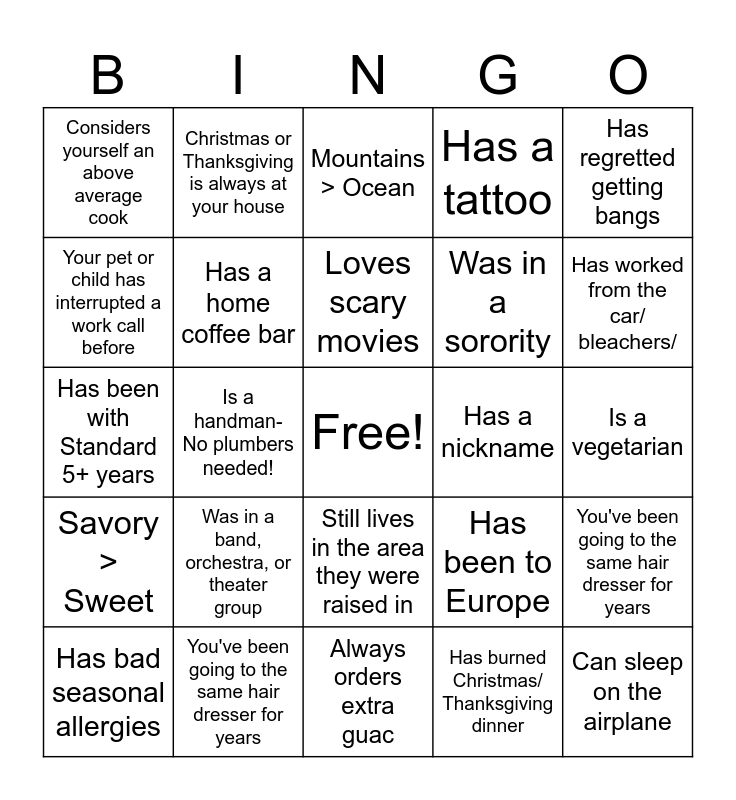 This bingo card has a free space and 24 words: Was in a band, orchestra, or theater group, You've been going to the same hair dresser for years, Loves scary movies, Has bad seasonal allergies, Has regretted getting bangs, Considers yourself an above average cook, Your pet or child has interrupted a work call before, Christmas or Thanksgiving is always at your house, Has a nickname, Still lives in the area they were raised in, Was in a sorority, Has been with Standard 5+ years, Has been to Europe, You've been going to the same hair dresser for years, Has a home coffee bar, Has burned Christmas/ Thanksgiving dinner, Is a vegetarian, Mountains > Ocean, Has worked from the car/ bleachers/, Is a handman- No plumbers needed!, Can sleep on the airplane, Savory > Sweet, Has a tattoo and Always orders extra guac.