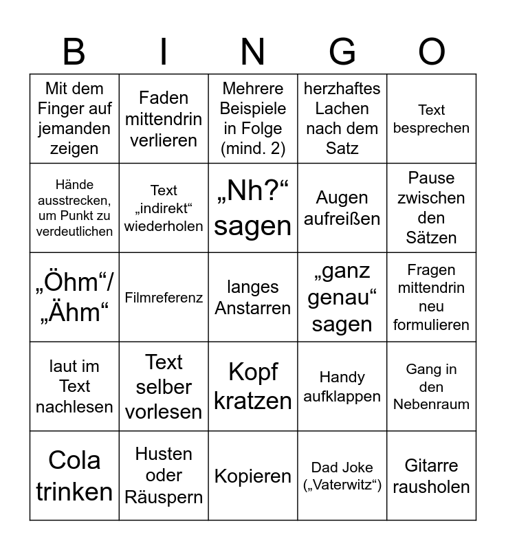 This bingo card has 25 words: Text selber vorlesen, Kopieren, „Nh?“ sagen, Cola trinken, Text besprechen, Mit dem Finger auf jemanden zeigen, Hände ausstrecken, um Punkt zu verdeutlichen, Faden mittendrin verlieren, „ganz genau“ sagen, Kopf kratzen, Augen aufreißen, „Öhm“/„Ähm“, Handy aufklappen, Gang in den Nebenraum, Text „indirekt“ wiederholen, Gitarre rausholen, Fragen mittendrin neu formulieren, Mehrere Beispiele in Folge (mind. 2), Pause zwischen den Sätzen, Filmreferenz, langes Anstarren, Husten oder Räuspern, laut im Text nachlesen, herzhaftes Lachen nach dem Satz and Dad Joke („Vaterwitz“).