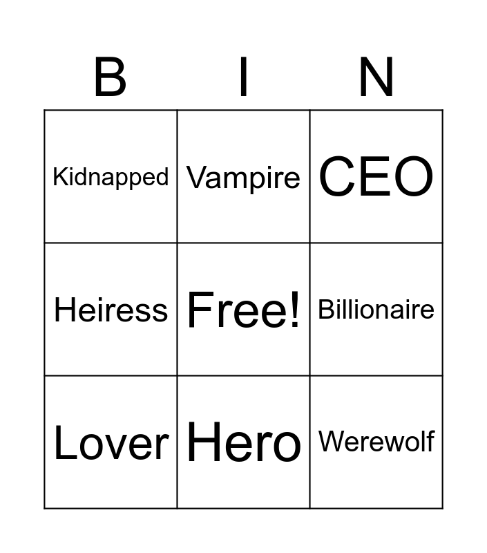 This bingo card has a free space and 8 words: Billionaire, CEO, Vampire, Lover, Kidnapped, Werewolf, Heiress and Hero.