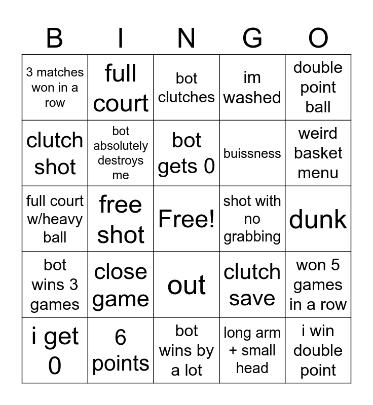 This bingo card has a free space and 24 words: close game, 6 points, bot gets 0, i get 0, double point ball, 3 matches won in a row, clutch shot, full court, shot with no grabbing, out, buissness, full court w/heavy ball, clutch save, won 5 games in a row, bot absolutely destroys me, long arm + small head, dunk, bot clutches, weird basket menu, free shot, i win double point, bot wins 3 games, im washed and bot wins by a lot.