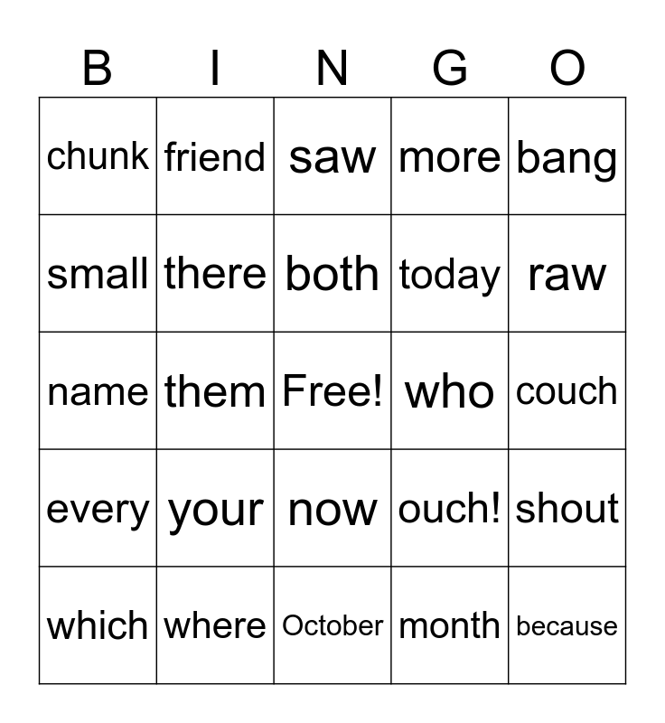 This bingo card has a free space and 24 words: your, where, both, which, bang, chunk, small, friend, who, now, today, name, ouch!, shout, there, month, couch, saw, raw, them, because, every, more and October.