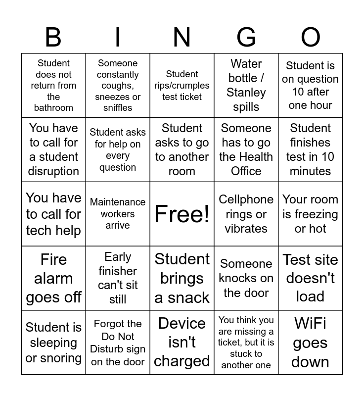 This bingo card has a free space and 29 words: Student is sleeping or snoring, Intercom Announcement is made, Maintenance workers arrive, Student does the "potty dance", Student does not return from the bathroom, Student rips/crumples test ticket, Student asks for help on every question, Early finisher can't sit still, Cellphone rings or vibrates, Forgot the Do Not Disturb sign on the door, Your room is freezing or hot, WiFi goes down, Device isn't charged, You think you are missing a ticket, but it is stuck to another one, Student finishes test in 10 minutes, Student pulls out their cellphone, Student brings a snack, Fire alarm goes off, Student is on question 10 after one hour, You have to call for tech help, Someone knocks on the door, Student gets log in error, Someone has to go the Health Office, You have to call for a student disruption, Water bottle / Stanley spills, Someone constantly coughs, sneezes or sniffles, Test site doesn't load, Student asks to go to another room and Someone cries.