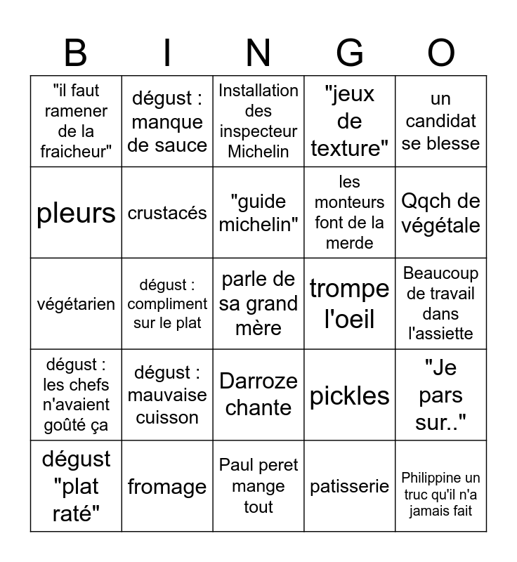 This bingo card has a free space and 66 words: Etchebest frappe un candidat, dégust : coup de coeur, Charlie est normand, "Je pars sur..", jeux de mots pourris, Noé est belge, dégust : manque de sauce, Charlie a la collection des guides michelins, "guide michelin", remarque beauf / sexiste, Darroze chante, dégust : pas assez d'assaisonnement, Beaucoup de travail dans l'assiette, un candidat se blesse, Le Quellec a fait Top Chef, pleurs, dégust : compliment sur le plat, "il faut ramener de la fraicheur", quelque chose tombe, les monteurs font de la merde, dégust : mauvaise cuisson, dégust : les chefs n'avaient goûté ça, "jeux de texture", quelque chose brûle, Une machine tombe en panne, revisité / déstructuré, allusion à la guerre, Margot mait son terroir à l'honneur, Philippine un truc qu'il n'a jamais fait, "on voyage", dégust "plat raté", hors-sujet, on voit les coulisses, Ça pourrait être une assiette dans mon restaurant/étoilé, pickles, fromage, champignon, végétarien, patisserie, terre / mer, crustacés, friture, trompe l'oeil, Bisou, Bamos, "Reve", Qqch de végétale, C'est moche, Claudio a fait les palaces, Sean est hors norme, Sean fait un truc lunaire, Philipine aide charles, Charles et philippine sont en couple, Citron caviar, Pub en thême avec l'épreuve, Pub avec un ancien, Restaurant éphémère, Peut etre gagner une étoile, Installation des inspecteur Michelin, Paul peret mange tout, Ça peut être une expression, 10 "coup de cœur", Sean donne un titre de livre a son plat, La machine du 93 (grégroire), Charlie n'a pas été dégusté and Chef perret fait l'avion.